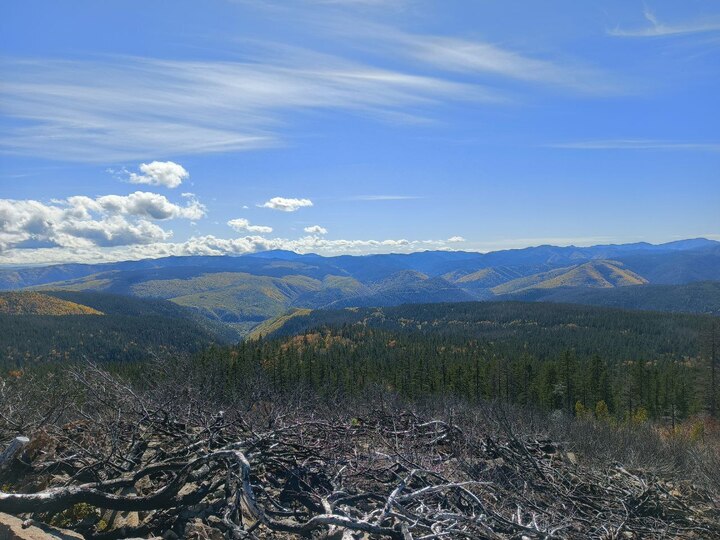 Дальше путь нас вел к глэмпингу. Оттуда мы двинулись на вершину Лысой горы по неплохой проторенной в тайге дороге. Солнце светило ярко, но холодный ветер заставил нас надеть курточки. Яркие краски осени: листья, ягоды, хвойники, заросли рододендрона, – сделали наш подъем веселым и праздничным. Ближе к самой вершине мы перебирались через корни, наступали в мягкий толстый мох и неожиданно оказались на плато с выгоревшими зарослями стелящейся сосны. Вид открылся невероятный! Даже чуточку инопланетный.
