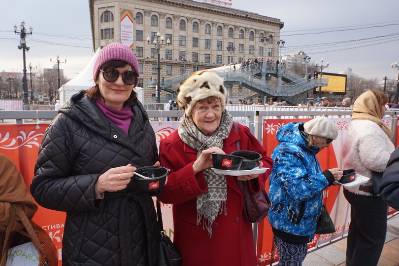 Порывы ветра лишь изредка сносили одноразовую посуду, но пришедших это не отпугивало. Люди продолжали веселиться и пританцовывали вместе с творческими коллективами, покорно ожидая в очереди по 20-40 минут. А самые запасливые пришли на праздник с судочками и брали кое-что и с собой.