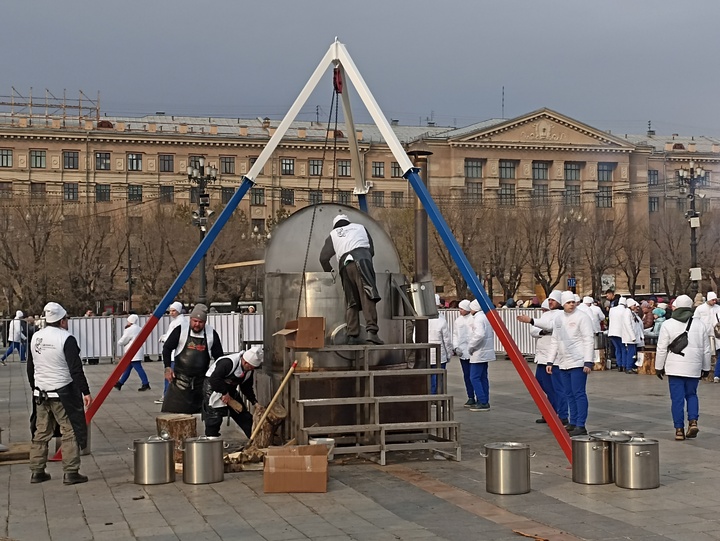 Готовиться начали за несколько недель до празднования: собрали продукты и подготовили огромный чан для супа, не забыли и о специальной униформе для поваров.