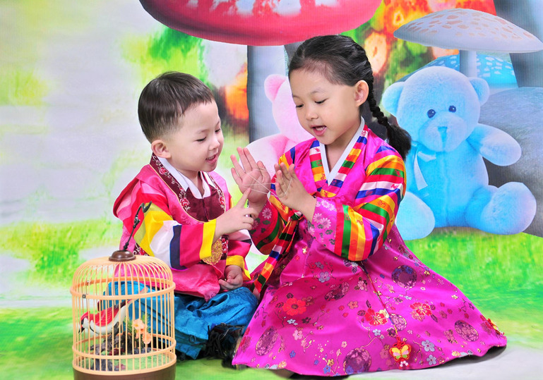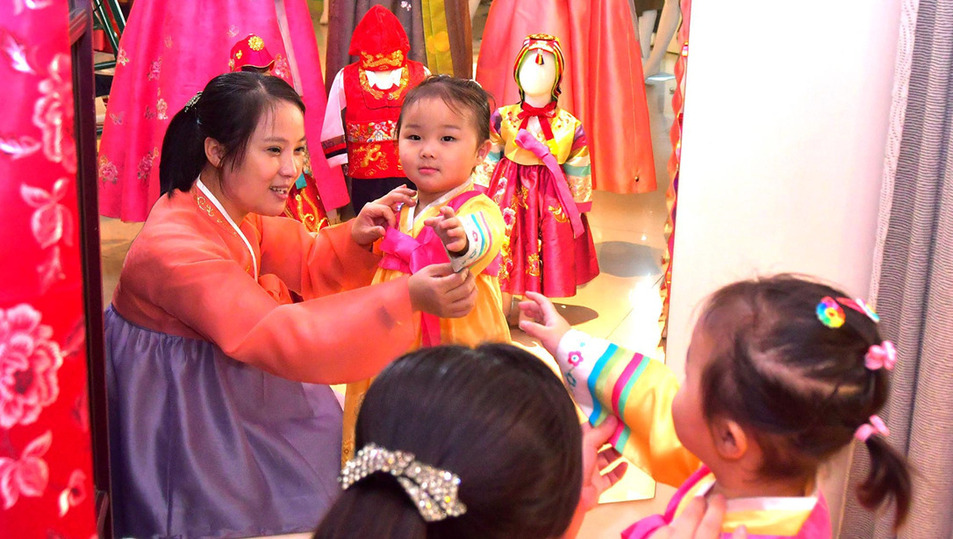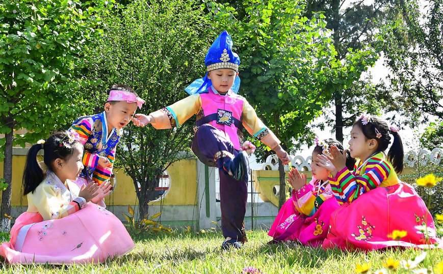 Дети в КНДР любят одевать красивую радужную чогори (кофта с рукавами из разноцветных лент) с роскошными цветами и узорами и красивым видом.