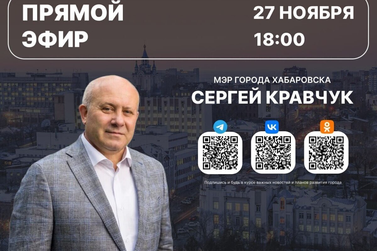 Мэр Хабаровска Сергей Кравчук объявил о проведении прямой линии с жителями города. Эфир состоится в четверг, 27 ноября, в социальной сети «ВКонтакте».