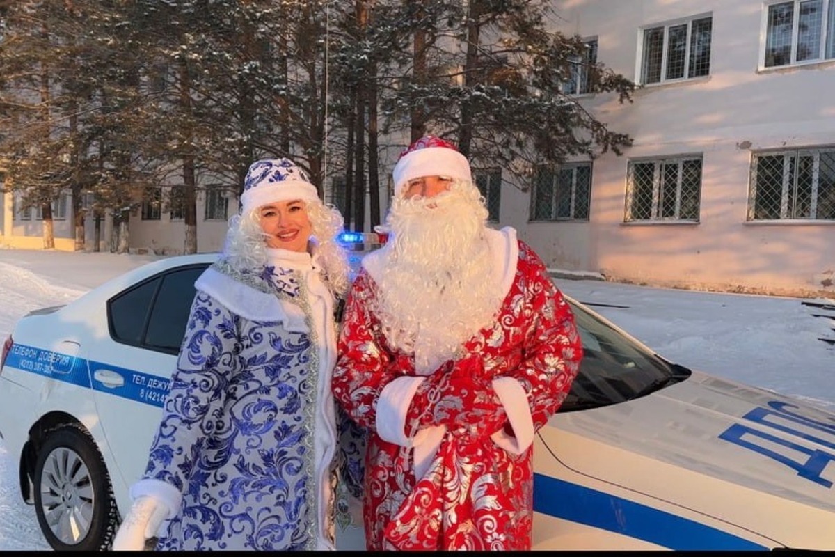 В городе Амурске прошла акция «В Новый год по безопасным дорогам». В рамках всероссийской акции «Полицейский Дед Мороз» дорожные инспекторы вышли на улицы вместе со сказочными персонажами.