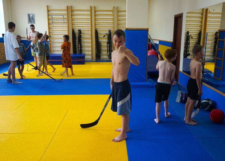 На льду «Платинум Арены» слабовидящие хоккеисты тренируются до лета. Чтобы ребята не теряли физическую форму и навыки командной игры, тренеры продумали для них серию занятий и на жаркий сезон. Спортсмены приходили в спортзал, где выполняли силовые упражнения, на улучшение координации движений и укрепление мышц.