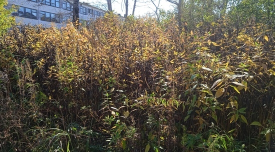 Совсем рядом со школой лесонасаждения, превращающиеся в стихийную свалку. Среди листвы можно разглядеть заброшенное бомбоубежище. Для обороны, оно, конечно нужное. Но для шалопаев, любящих подымить на переменке еще нужнее.