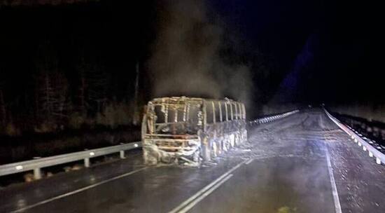 После станции "Половинка" в салоне сработал пожарный датчик. Транспортное средство оперативно покинули 27 пассажиров, пострадавших и погибших нет. Однако, автобус полностью сгорел в течение десяти минут. Работают специалисты.